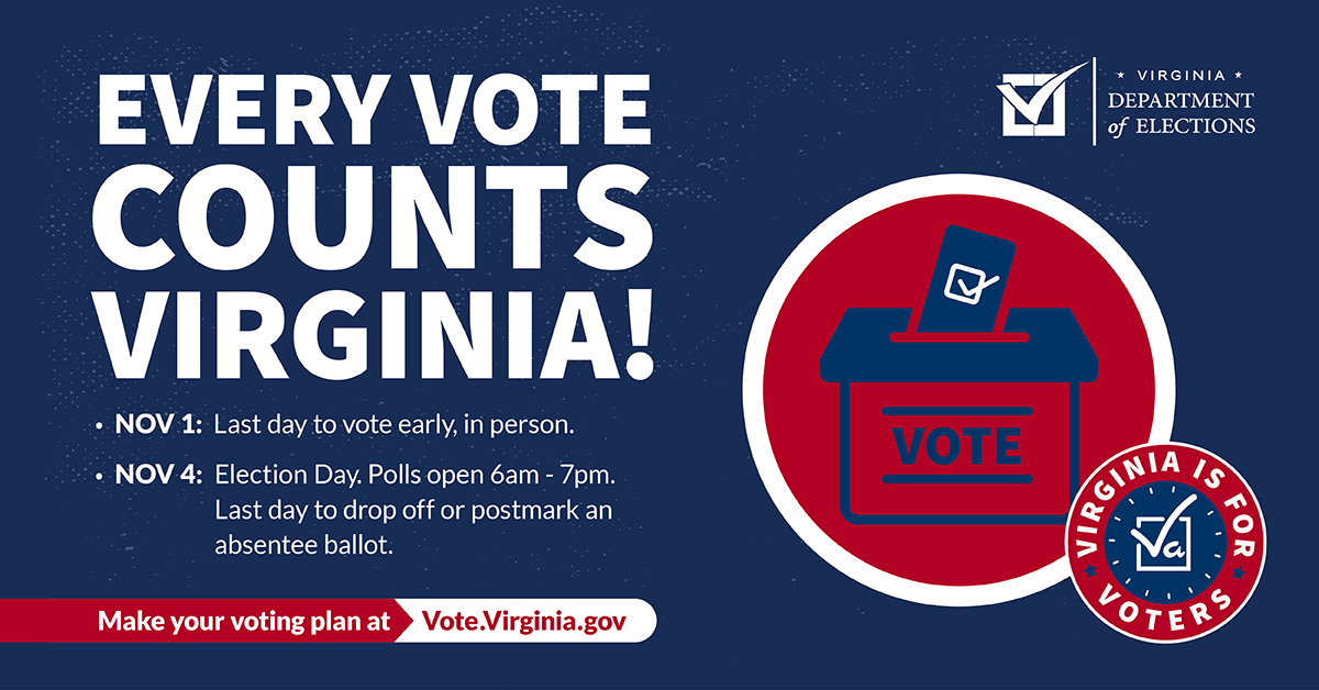 The polls are open for the state-level races in Virginia — Governor, Lt. Governor, Attorney General, all 100 seats in the House of Delegates, as well as important local bond referendums. Election day, a state holiday, is Tuesday November 4, but early voting is happening right now, and will continue through the Friday before election day.